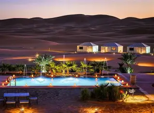 - Campamentos estilo bereber con alfombras, fuego nocturno y camas gigantes